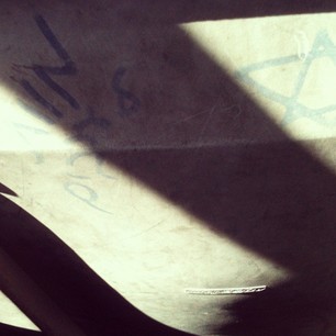 Operation Cast Lead was the event that shattered many of my Perception-Illusions, and cha[lle]nged many of my core beliefs re: the conflict & Israel. I saw a graffiti- faded, old, maybe two and a half years?- on the bus last week that illustrated, in a simple, dusty, upside-down and ugly way why that was: