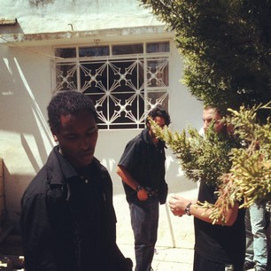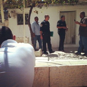 The dark-hued Jews guard the light-hued Jews as they moved into part of the house belonging to medium-hued Palestinians.