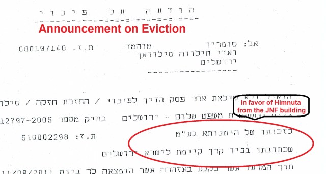 And Hagit Ofran publicized the Eviction Notice, which is issued in Himanuta’s name, along with documentation proving that Himanuta is 100% owned by the JNF: