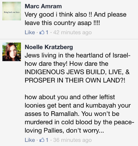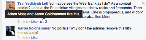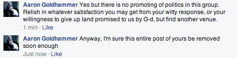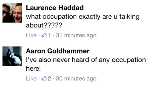 And before including the rest of the screenshots, I’ll lose the snark for a moment and say that I was actually really surprised. I certainly can be provocative and write things that are angering and frustrating, and when I do that, I respect and expect harsh responses, but here, my original posting wasn’t a particularly controversial one, and was, in fact, pretty innocuous. Except for the fact that I used the word “occupation.” (These screenshots are from my cellphone).