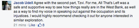 So, earlier this evening, as I was twiddling around Facebook, I had the idea of posting in Secret Tel Aviv, a Facebook group of 41,000+, mostly anglo-Jewish folks living in the Tel Aviv area. Most of the posts are about furniture, but I don’t know much about furniture, so I decided to post about something I do know a bit more about: The Occupation. Or, more specifically, I decided to invite folks to come join the All That’s Left anti-occupation collective, which is also made up primarily of anglo-Jewish folks living in the Tel Aviv area.