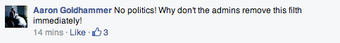 It has been my experience that usually, when folks say “no politics,” they really mean “no politics that are different from mine.” And that such a claim usually comes from the Right, alongside the claim of “if only you were more polite…” But can I prove that that is what Aaron was saying, rather than just trying to preserve a neutral, apolitical atmosphere? In case his use of the word “filth” was not enough, he was, in this case, caught red-handed expressing his beliefs, or, more accurately: red-thumbed: