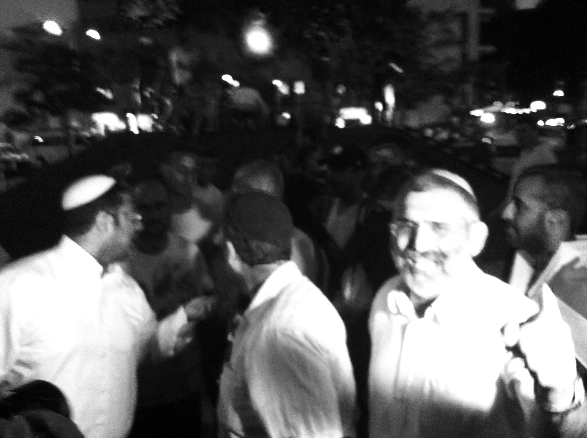 They were wearing yarmulkehs. But there was another person I saw wearing a yarmulkeh: Uriel Ferera, the young, Orthodox refusenik who is currently spending time in Israeli military jail because of his opposition to the occupation. We’d corresponded, but this was the first time we’d met. We hugged. He was here on his weekend off, in between jail-stints, to protest.