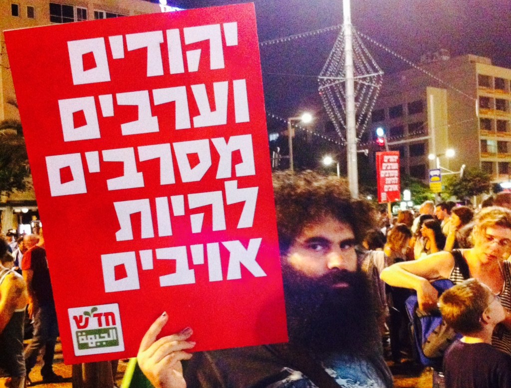15,000 people protesting against the occupation and for peace in Tel Aviv. That is a lot of people. Not compared to other eras in Israeli history: some estimate that 400,000 gathered in Tel Aviv to protest the Israeli-sanctioned massacre in Sabra and Shatila in Lebanon in 1982. But certainly compared to the last month and a half, and even the last few years: Israeli journalist Haggai Matar, whose intuition I trust much more than any media or police estimate, not least because he is actually there at most of these protests, wrote in his post about the protest (Here, in Hebrew) that he doesn’t remember a demonstration of this size that focused on ending the occupation and took place in a Jewish or mixed city since 2009 (during Operation Cast Lead- when there was no +972 Magazine, no Sikha Mekomit, and I was but a political zygote, ie., a non-blogging non-demonstrating college Sophomore in Vermont: as such, I’m having trouble finding a good link about the Tel Aviv demos then, so just trust Haggai along with me. And check out the +972 Magazine report on last night’s protest to which Haggai and I contributed via Twitter).