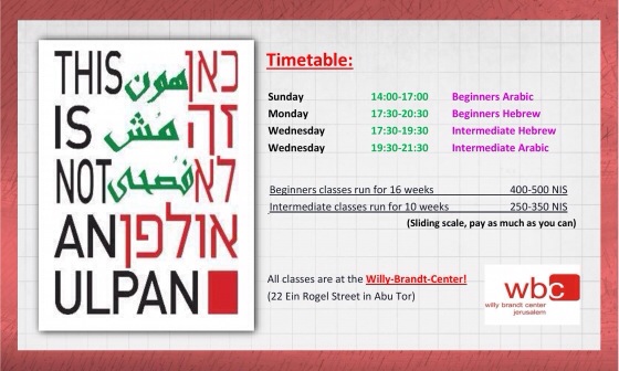 Right after my session will be the Intermediate Arabic class, from 7:30-9:30 PM. Beginners Arabic will be from 2-5 PM on Sunday. Beginners Hebrew will be Mondays from 5:30-8:30 PM.
