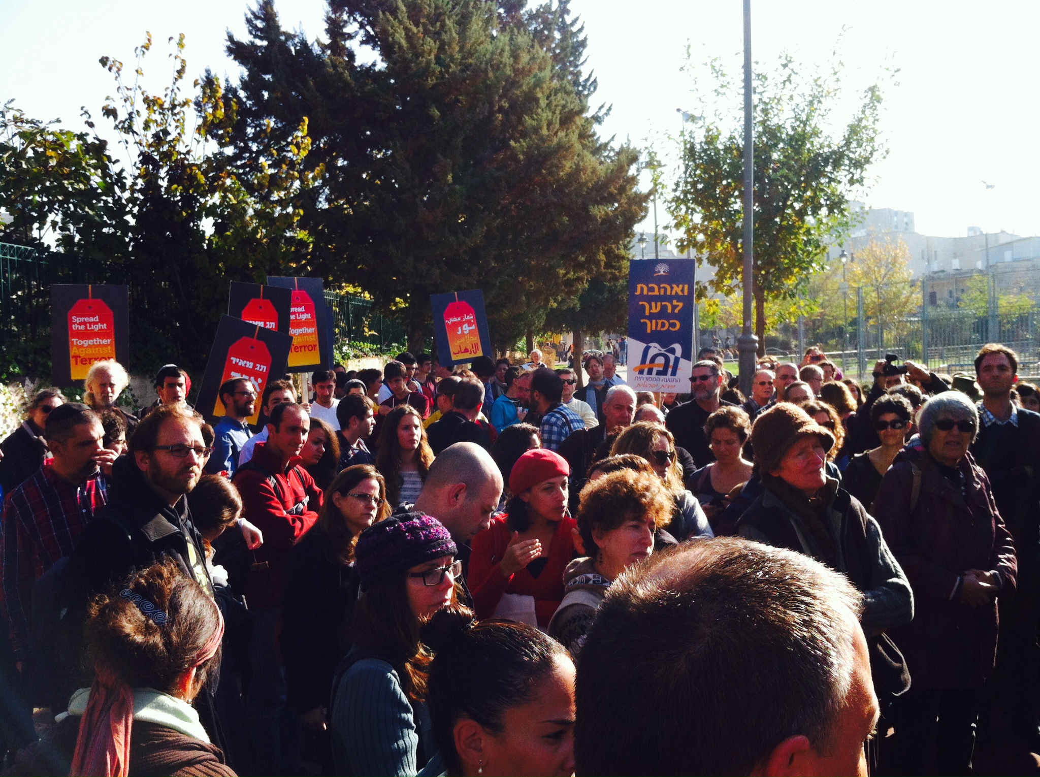 3. This morning, I went to a vigil in support of the school, organized by the Tag Meir – Light Tag Forum (a play on Tag Mekhir – Price Tag, a catchall term used to describe anything ranging from hate graffiti to burning of mosques (and schools) by random extremists). I returned from this vigil feeling conflicted. First and foremost, I am very grateful for the initiative, and it seems incredibly important for the kids at the school to see that there are many, many people who support them and their school: Over 200 people were at the vigil, including students from other Jerusalem schools like Hartman, Keshet, Kedma and Himmelfarb. There were also Members of Knesset, members of the Jerusalem Municipality, and religious leaders. All of this was wonderful, and worth noting.