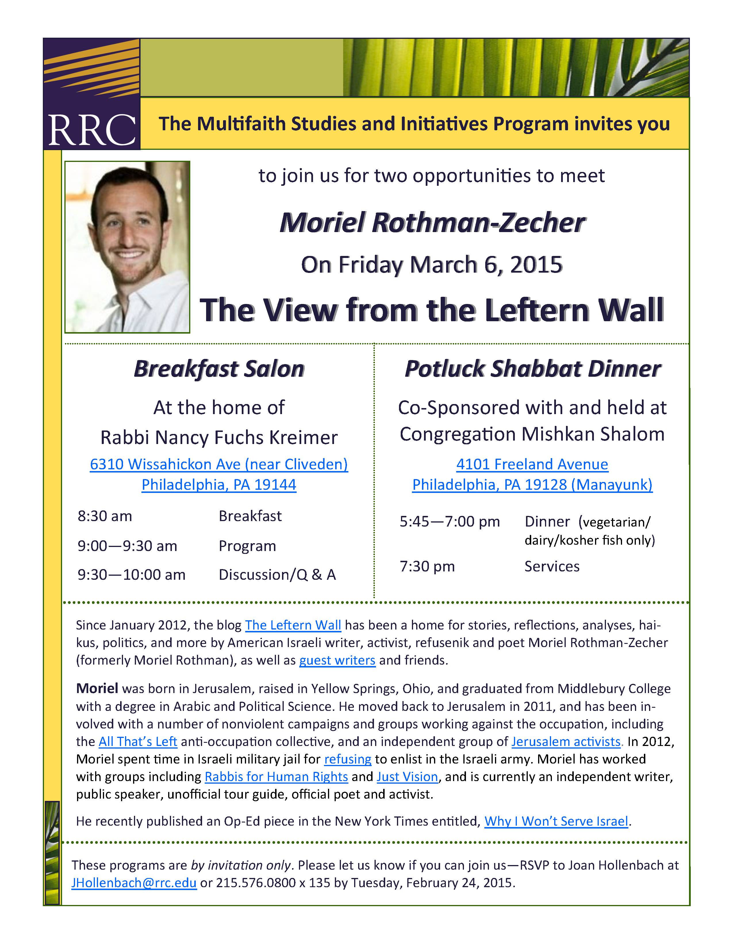”Moriel Rothman-Zecher spent four days with us in Philadelphia in March 2015. We only wish it could have been longer! Mori used original poetry, personal storytelling and thoughtful conversation (both speaking and listening) to educate us about the challenges facing Israel and the Jewish people. His diverse audiences left his presentations inspired to continue their learning and activism and blessed by Mori’s wisdom and compassion.”