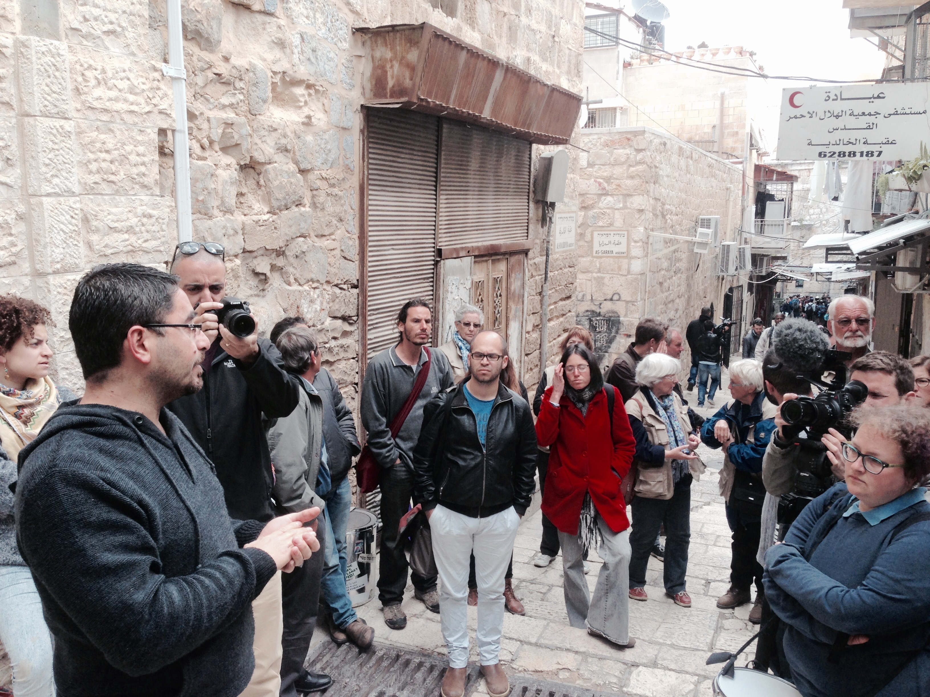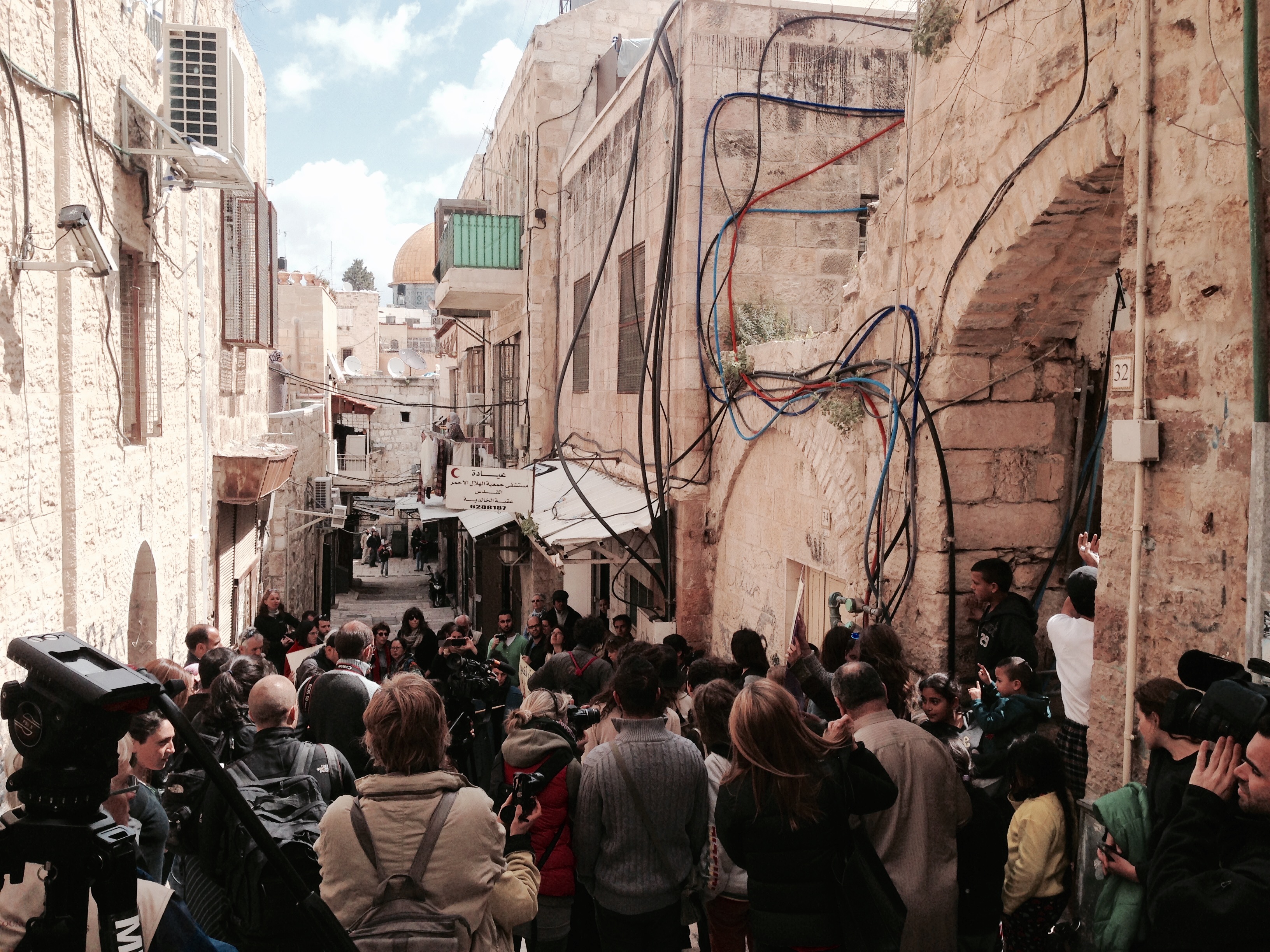 10:00 AM, Sunday, March 22nd: Ahmad Sub Leban, a friend and colleague, welcomes a group of about 60 activists and journalists outside of his family’s home in the Muslim Quarter of the Old City: “We are threatened with the potential of eviction any day. We have a discussion of our family’s case in the Supreme Court on May 31st. Despite this, the settlers and police have already tried to evict us three times since November. The presence of activists and media is crucial.”
