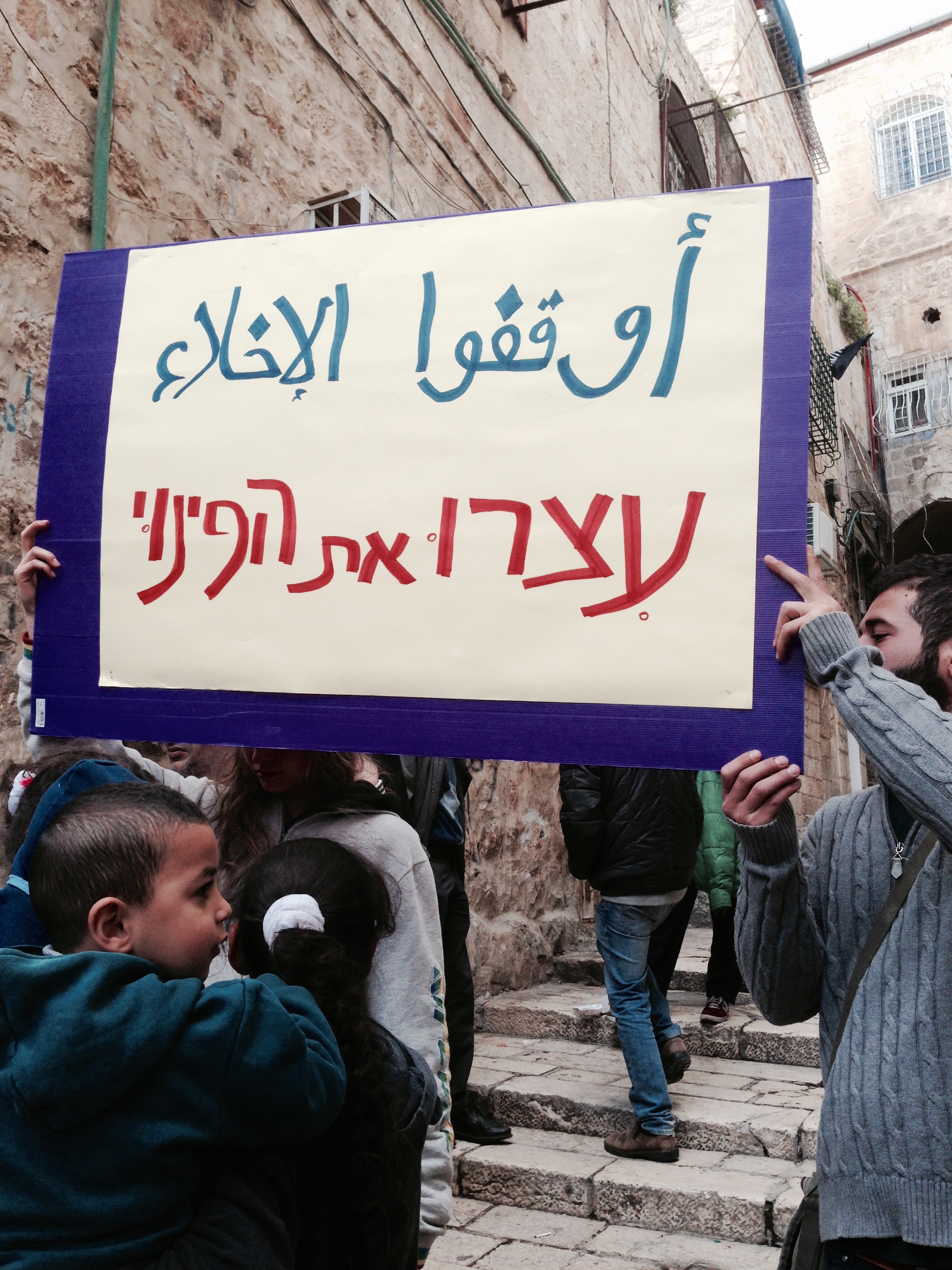 The police stayed at the edges of the demo until the end, Palestinian passersby ranged from bemused to supportive. Jewish Israeli passersby ranged from startled to bristling. This latter part made me sad. This is not a struggle against individuals: even if they’ve made decisions that I see as unjust (moving into a home from which a Palestinian family has been evicted), they are not the ones making the policy.
