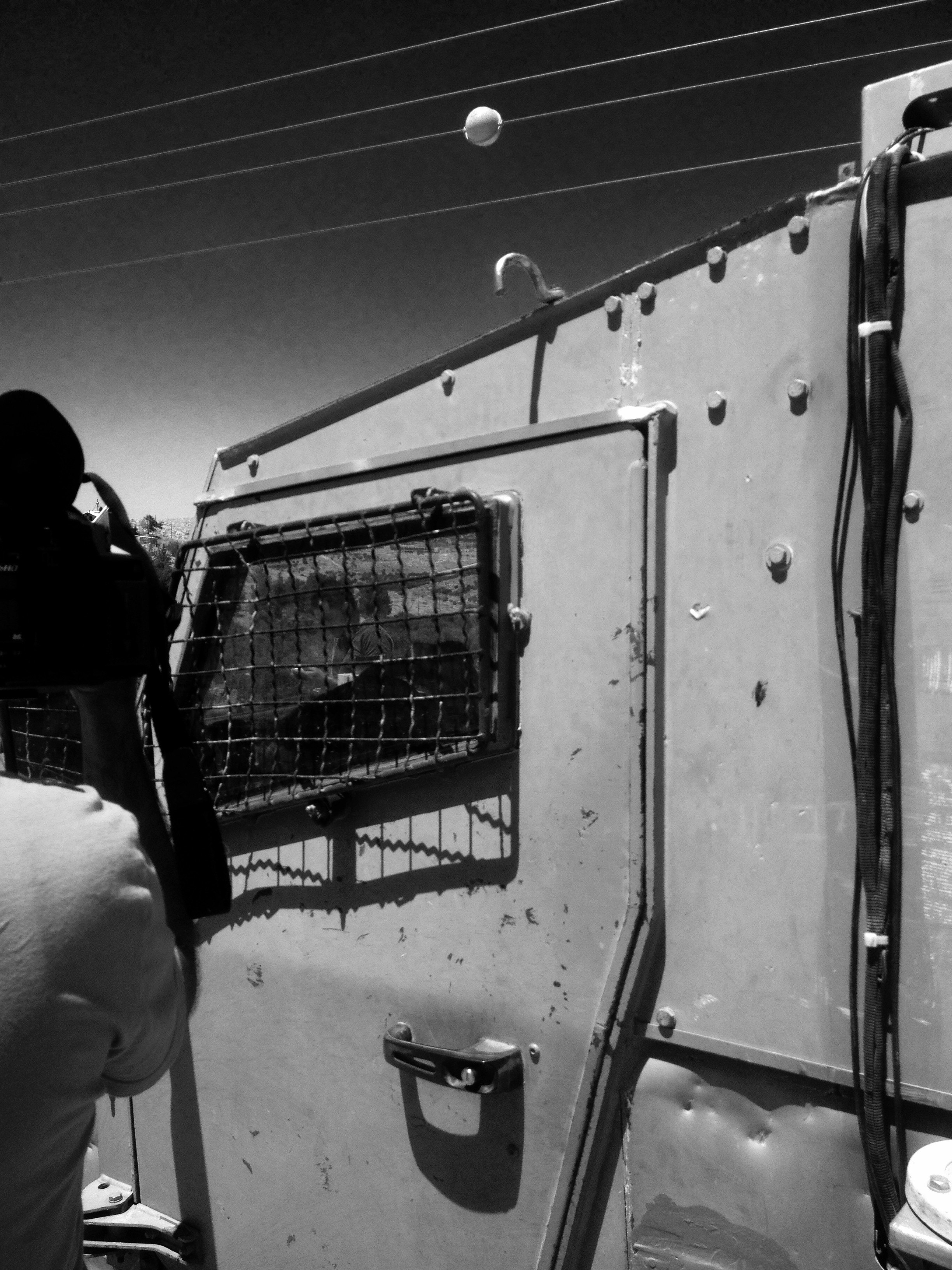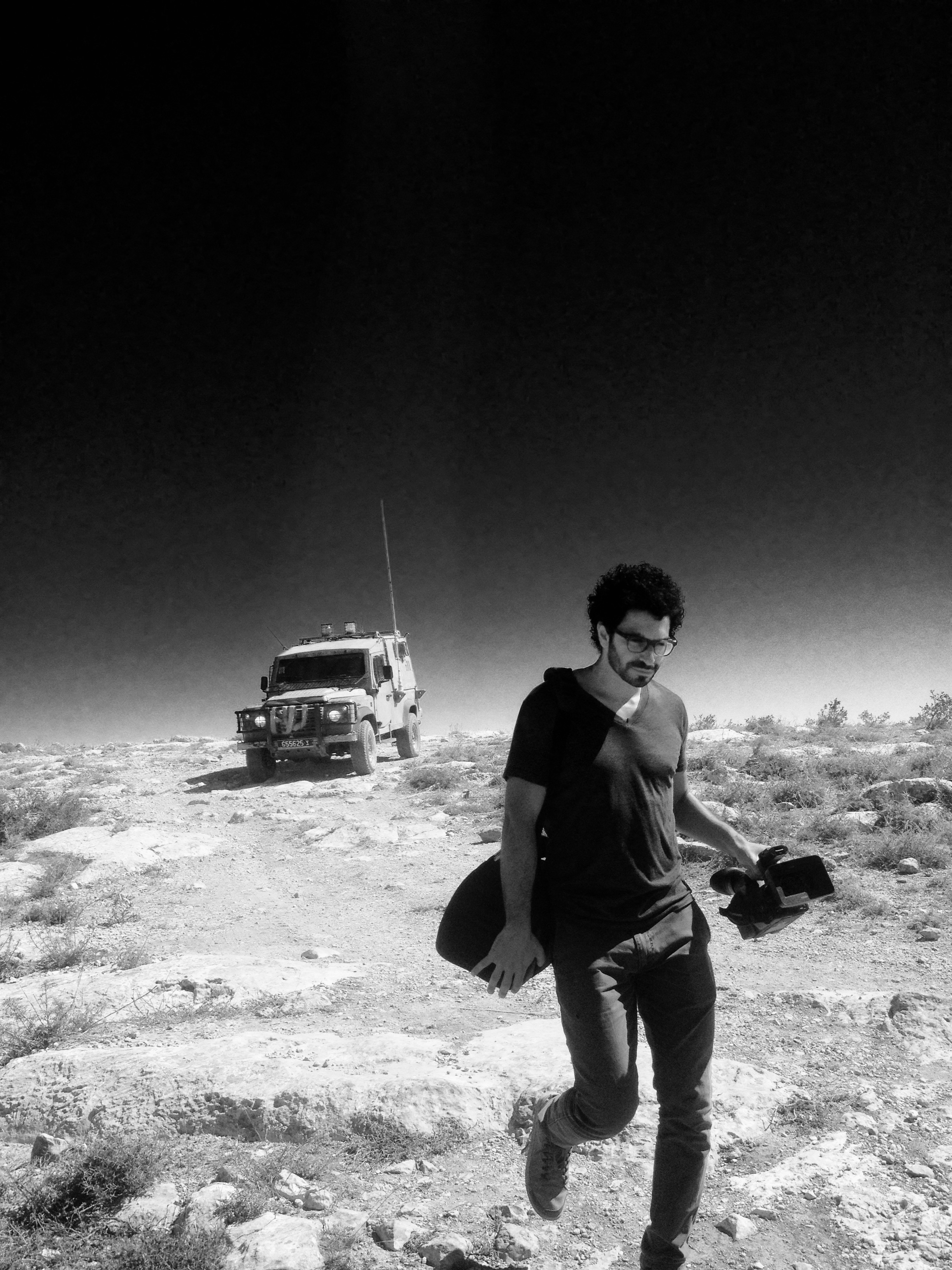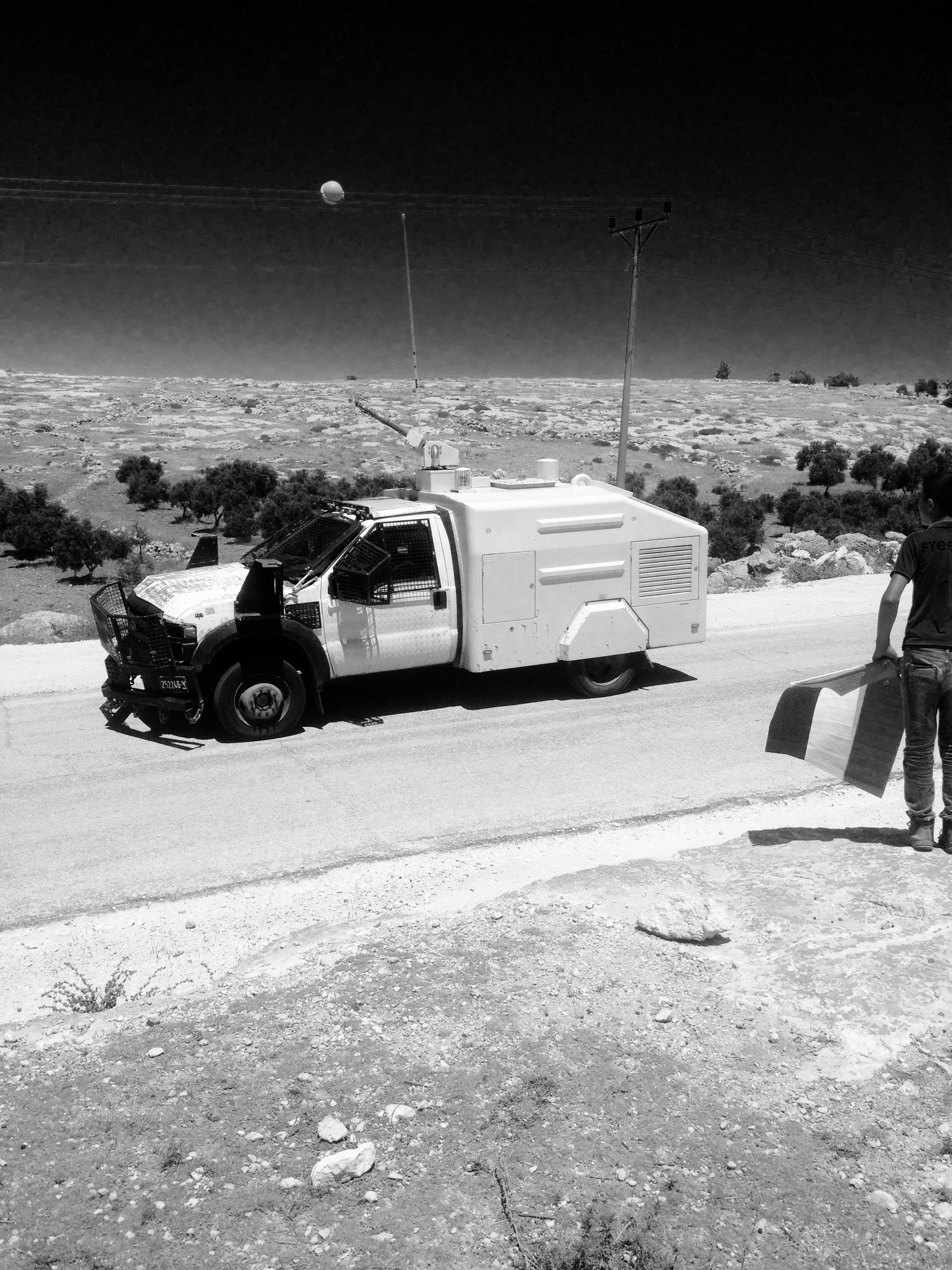 Yuval Orr, one of the 12 All That’s Left members who joined Ta’ayush in the South Hebron Hills this weekendEmily Schaeffer Omer Man, Kayla Rothman-Zecher and Karen Isaacs were there alsoAnd, of course, so were a few other folksSoon after arrived, we were escorted by a rowdy bunch of kids towards Wadi AlaraisThere, the usual scene, in the shadow of the settlement of Mizpeh Yair, was as odd as alwaysWe learned more from Ta’ayush’s Amiel Vardi about the nearby ”918 Firing Zone”And then everyone began to leave, Palestinians first, with the soldiers following. There would be no farming today.From there, we made our way to Susiya, where residents had invited supporters to take action, at 12:00 noon, against the recently renewed threat of demolition of their village“Welcome to the village of Susiya.”The first part of the action was renewing the messages on the tents, including a quote from Mahmoud Darwish: “On this land, there is that which deserves life.” And more direct messages, too: ”Save Susiya.”This struggle is not new to Susiya. That does not make it any less heartbreaking.The people of Susiya then began to march, holding Palestinian flags.They were joined by supporters from all over the West Bank (and elsewhere) Among the marchers was Abdallah Abu Rahmeh, a well-knonw leader of the popular struggle in Bil’in (pictured talking with Emily Schaeffer Omer Man)The march then reached the street, upon which someone had sprayed this precise, humane and just demand.There are no street signs in the occupied West Bank for most Palestinian villages. On the rocks near the street, someone sprayed, in Arabic, “Susiya.”The march headed towards the Archeological Site of Susiya’s Ancient Synagogue, from which the current Susiya’s residents had been expelled in 1986, and are now barred from enteringArmy jeeps quickly arrived on the sceneBut they were initially blocked from moving by the group’s nonviolent direct actionMeanwhile, marchers managed to hang Palestinian flags on the gated entrance to the the old Susiya.The army then sent its “skunk water” cannonBut the marchers, having accomplished what they’d set out to do — declare their presence, and their intention to stay in their village — began to disperse, and no one was sprayed.Threats, intimidation, courage, steadfastness, heat: Another day in the village of Susiya.