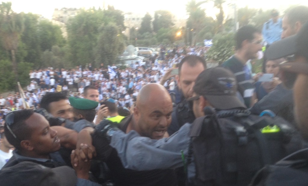 I understand the temptation that many have to write this off as a group of rowdy, obnoxious kids. But the essence of the matter is this: This is how the Jerusalem Day marches have looked every year that I’ve attended (2012, 2013, 2014 and yesterday). And yet the Israeli government still grants the marches permits to through the middle of Palestinian East Jerusalem, rather than finding a simple, alternative route to the Kotel. These kids are not the problem. They are swept up in an awful system, and it’s not hard to understand where they are coming from, even as I am crushed by their actions.