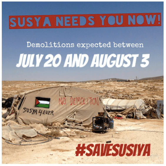 1. Residents of Susiya have called on activists and supporters to be present in the village from July 20th until August 3rd. Answer their call. Sign up for a shift (or more than one), which will last from evening (around 7PM) until 10AM the next morning. SIGN UP HERE.