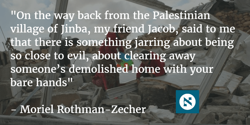 This evil is replicated in the threat of erasure that hangs over the nearby Susiya. It is replicated in the destruction of Palestinian homes rampant throughout the Jordan Valley. It is replicated in orders for demolition threatening the residents of Umm al-Kheir, who live in the literal shadow of the settlement of Carmel. It feeds off of inertia and indifference and fear. And it is growing. We can all feel it, even if we didn’t hold Jinba’s rubble in our hands this Shabbat.