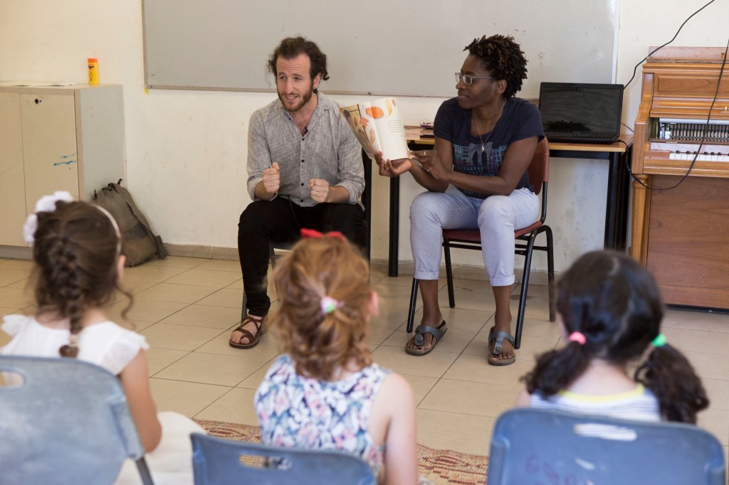 Photo: Me making silly faces as I do simultaneous translation to Hebrew and Arabic for the author Jacqueline Woodson, who read one of her amazing books to a bilingual preschool class at the Jerusalem Hand in Hand school this past summer. Photo by Oren Ziv.